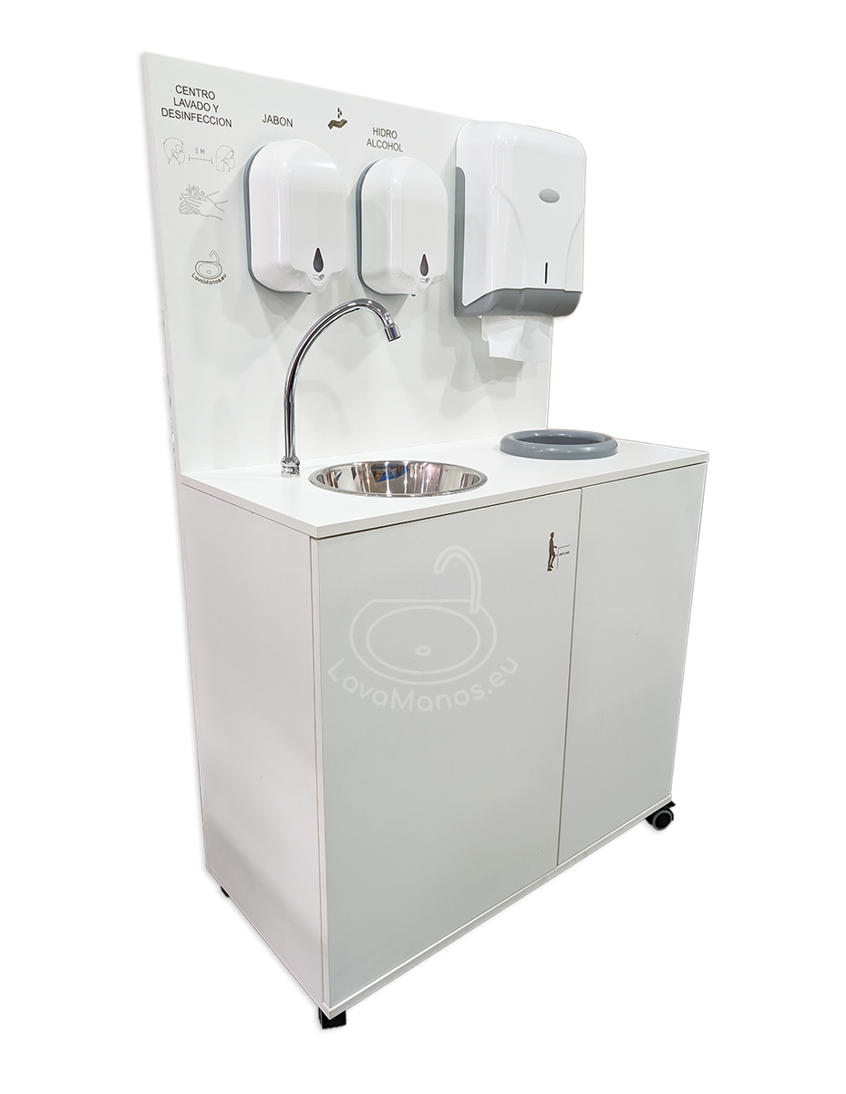 Centro de lavado y desinfección de manos portátil y autónomo. Bomba eléctricaNo necesita toma de agua ni desagüe. Dispensador de toallas tissue Dispensador infrarrojo para gel Dispensador infrarrojo para hidroalcohol Papelera 4 Ruedas, 2 con freno Posibilidad en otros colores y decoración personalizada con su logotipo. Consultar. |