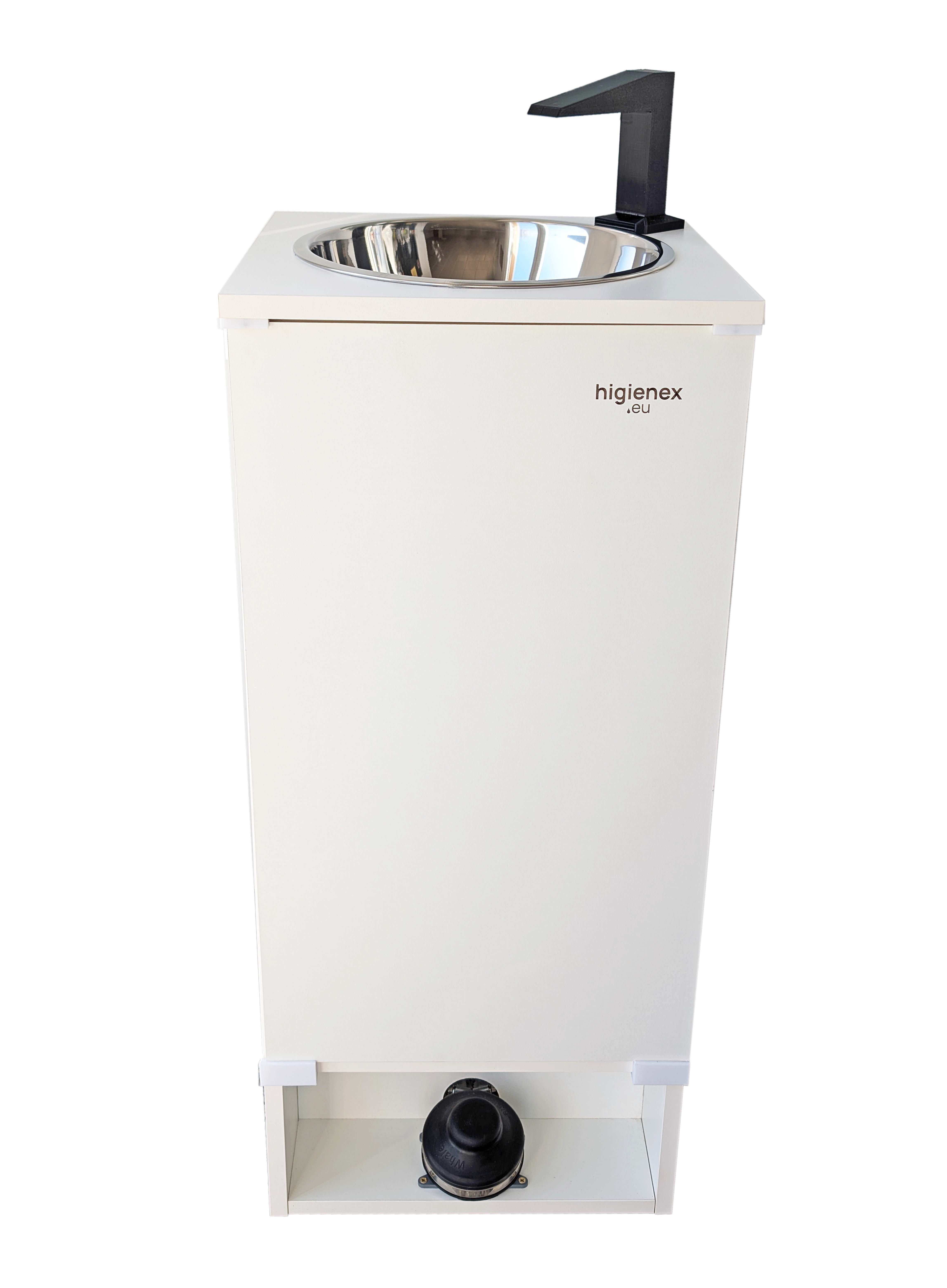 Lave-mains autonome portable Higienex. Pompe hydrauliqueFabriqué en mélamine blanche. 💧 Ne nécessite ni arrivée d’eau ni évacuation. ⚙️ Pompe hydraulique. Conforme aux normes sanitaires grâce à une utilisation 100 % sans contact manuel. Pas de raccordement requis. Contient deux bidons de 10 litres : un pour l’eau propre, un pour les eaux usées. Dimensions : 365 × 350 × 845 mm. Panneau frontal amovible pour un accès rapide. Pompe hydraulique à pédale avec débit de 8 litres/minute. OPTIONS : Kit d’eau chaude et distributeur de gel intégré au plan de travail. Voir ACCESSOIRES.