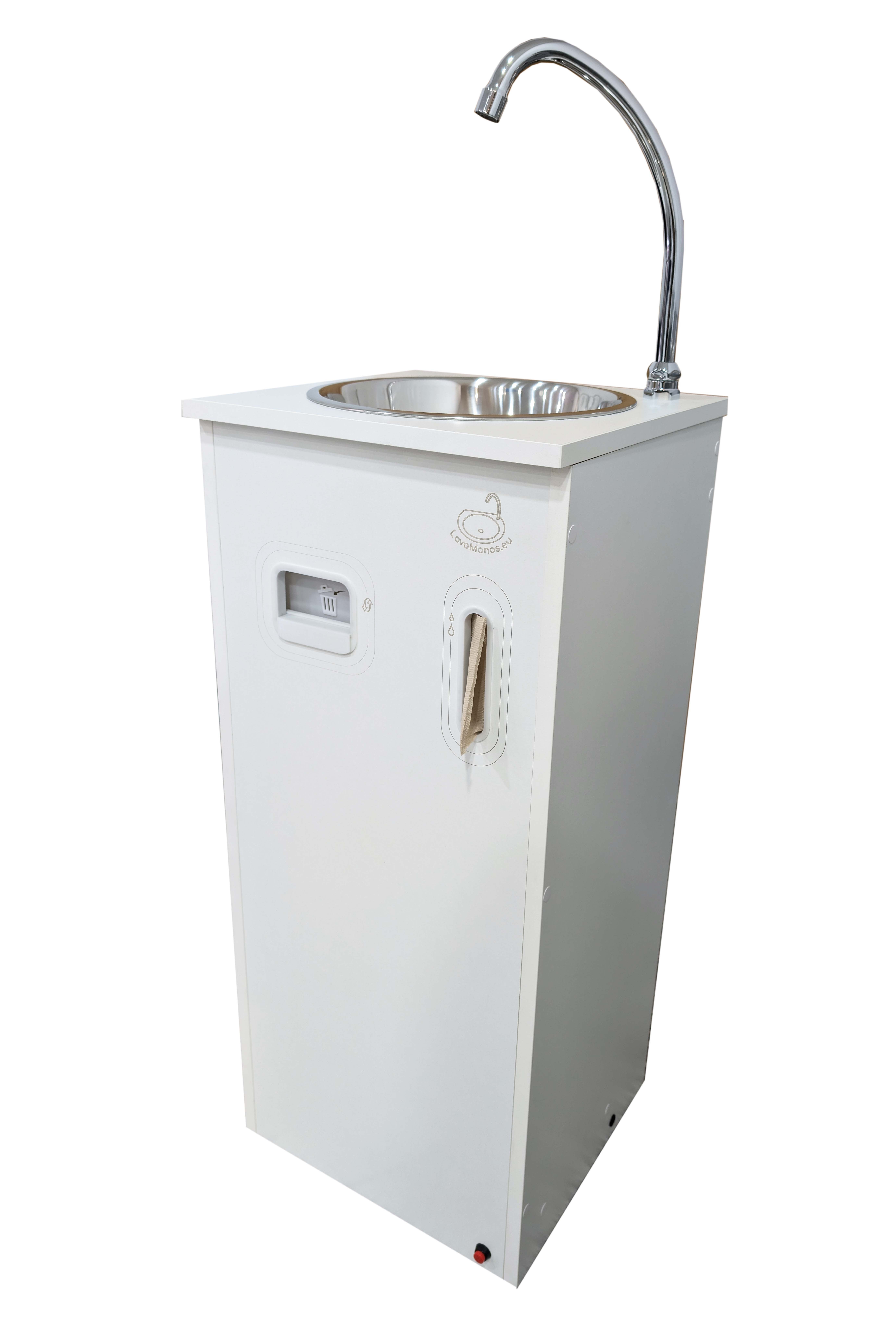 Lavamanos autónomo portátil Higienix Pro. EléctricoNo necesita toma de agua ni desagüe. Integrados en panel frontal dispensador de toallitas zigzag 105x110 mm y papelera. Trasera abierta. OPCIONES: KIT de agua caliente, dispensador de gel en encimera y Logotipo grabado con láser en la puerta. Ver en ACCESORIOS. |