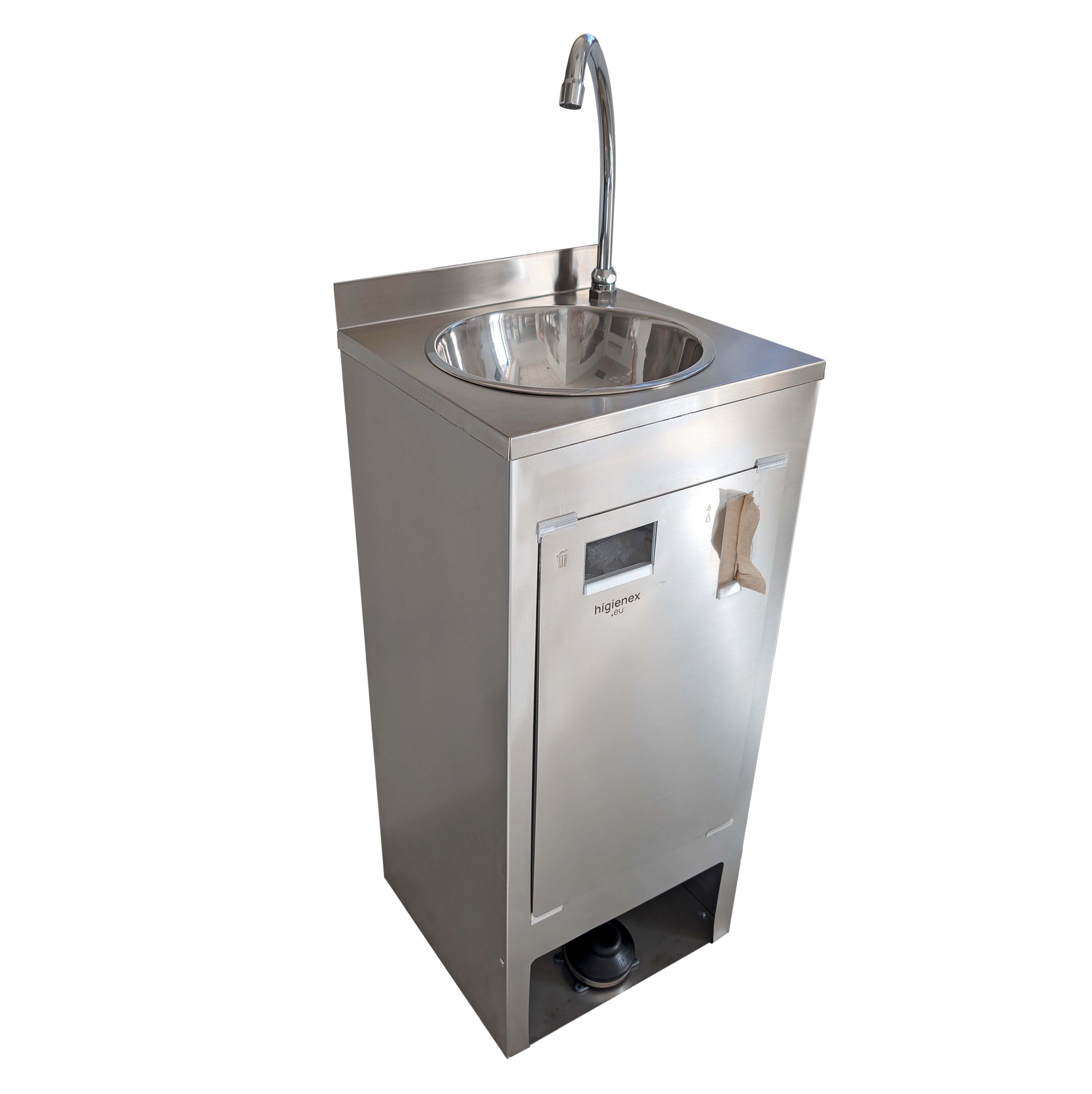 Lava-mãos autônomo em aço inoxidável Higienex Plus. Bomba hidráulicaNão requer conexão de água ou esgoto. Selecione o modelo de torneira. Fabricado em polietileno ou aço cromado, conforme o modelo. Móvel fabricado em aço inoxidável. Atende às normas sanitárias para acionamento não manual. Dois galões de 10 litros, um para água limpa e outro para água residual. Painel frontal removível para fácil e rápido acesso ao interior. Inclui dispensador de guardanapos e lixeira. Botão de bomba hidráulica com vazão de 8 litros por minuto. OPÇÕES: Kit de água quente e dispensador de gel na bancada. Veja em ACESSÓRIOS.